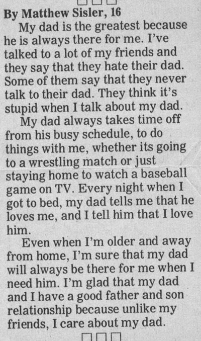 In 1991, The Augusta Chronicle had a special Father's Day promotion. Children were encouraged to write letters about their Dads and the winners were published. Matthew's letter was one of the chosen, and that faded, folded clipping is still in my wallet.